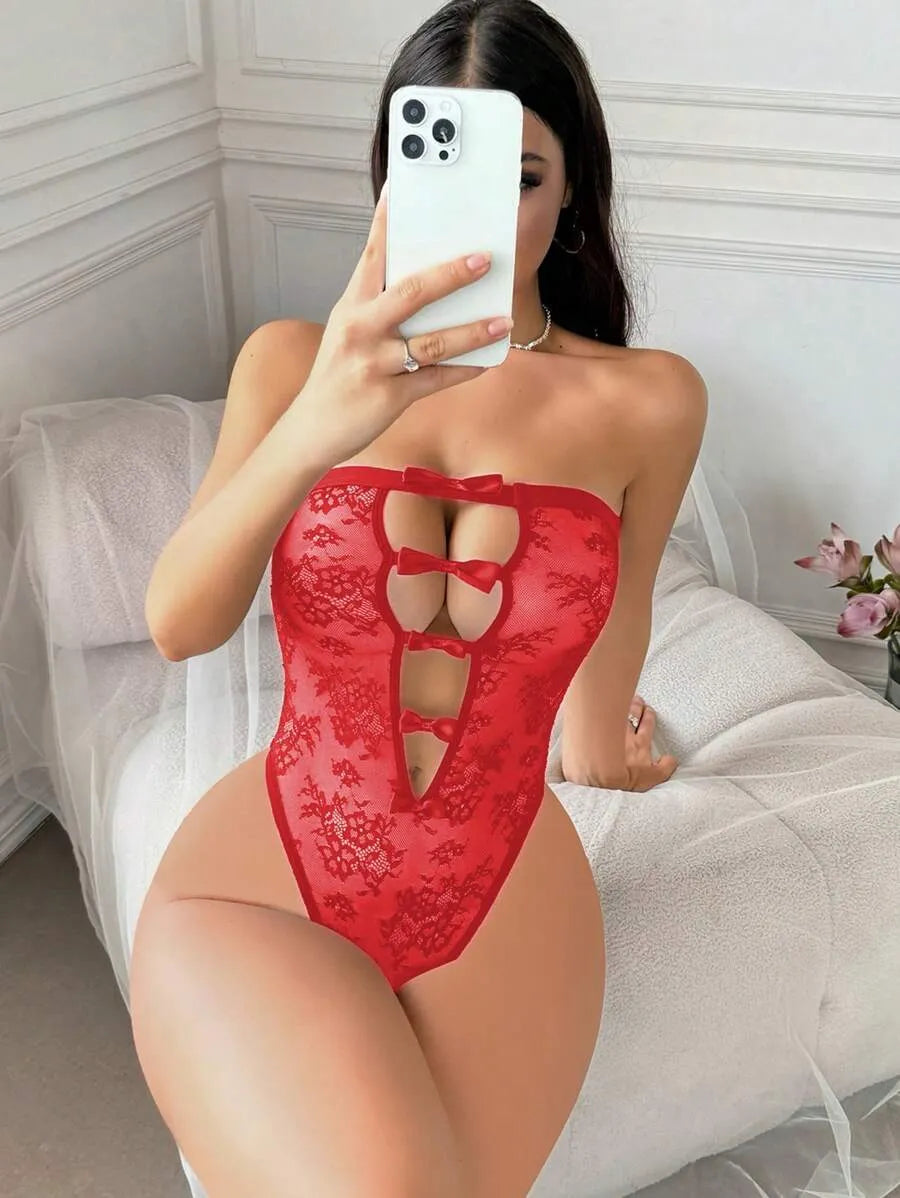 Classic Sexy Women's Bow Decor Hollow-Out Lace Jumpsuit – Elegant Bow Tie Lingerie