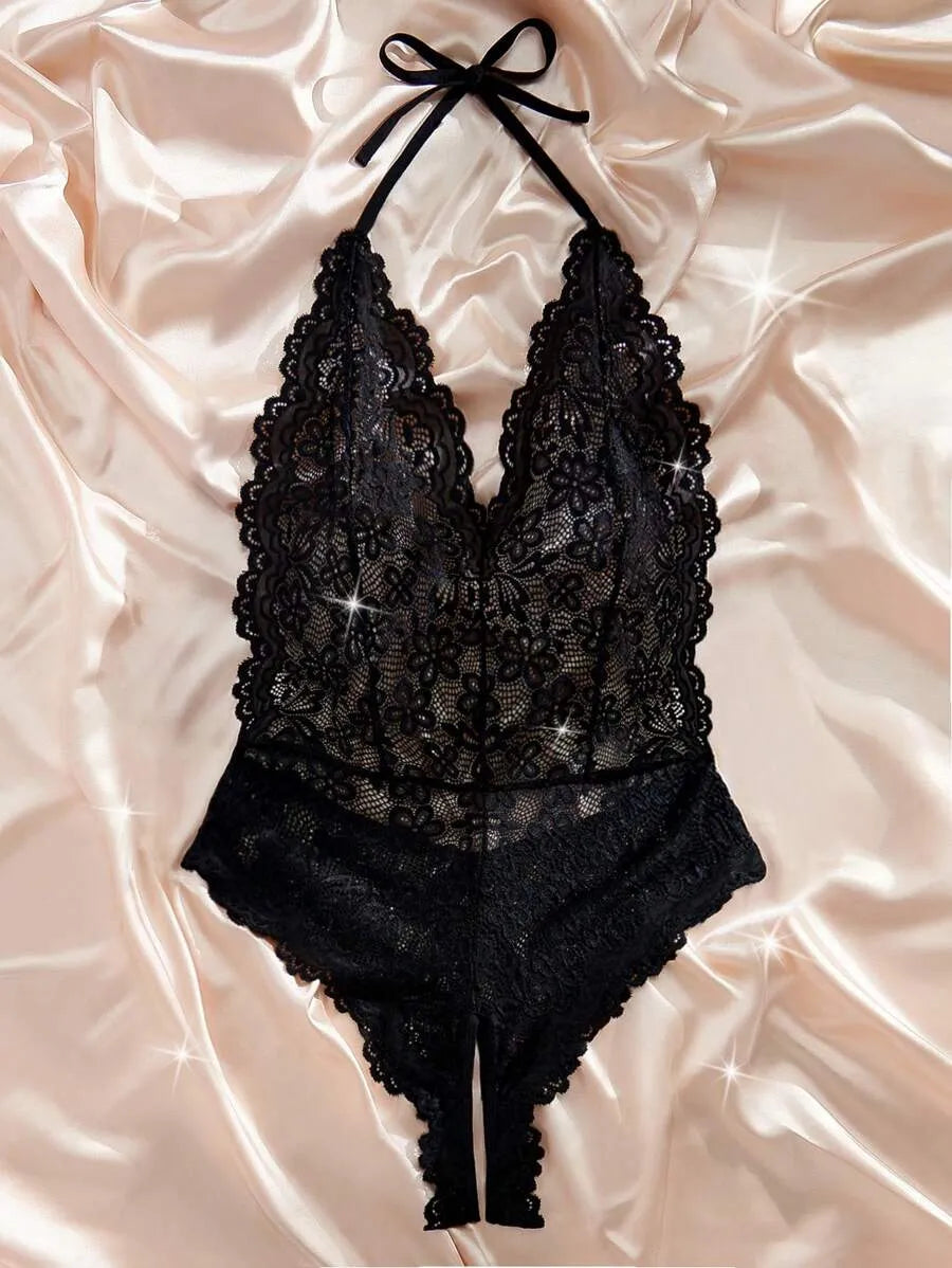 Classic Sexy Women's Halter Neck Lace Bodysuit – Elegant Sheer Lingerie One-Piece