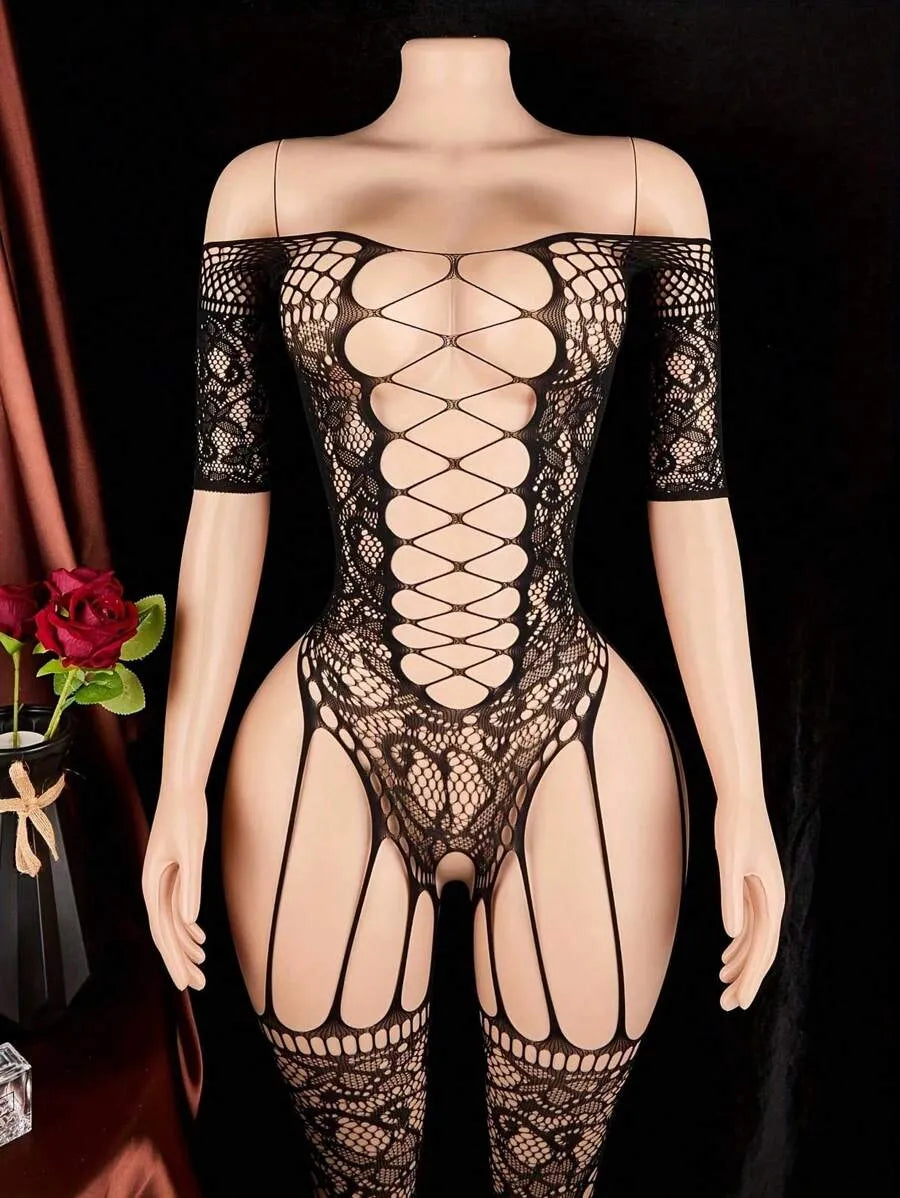 Sexy Fishnet Pajamas Jumpsuit with Jacquard Hollow Mesh – Romantic Lingerie Set for Valentine's Day